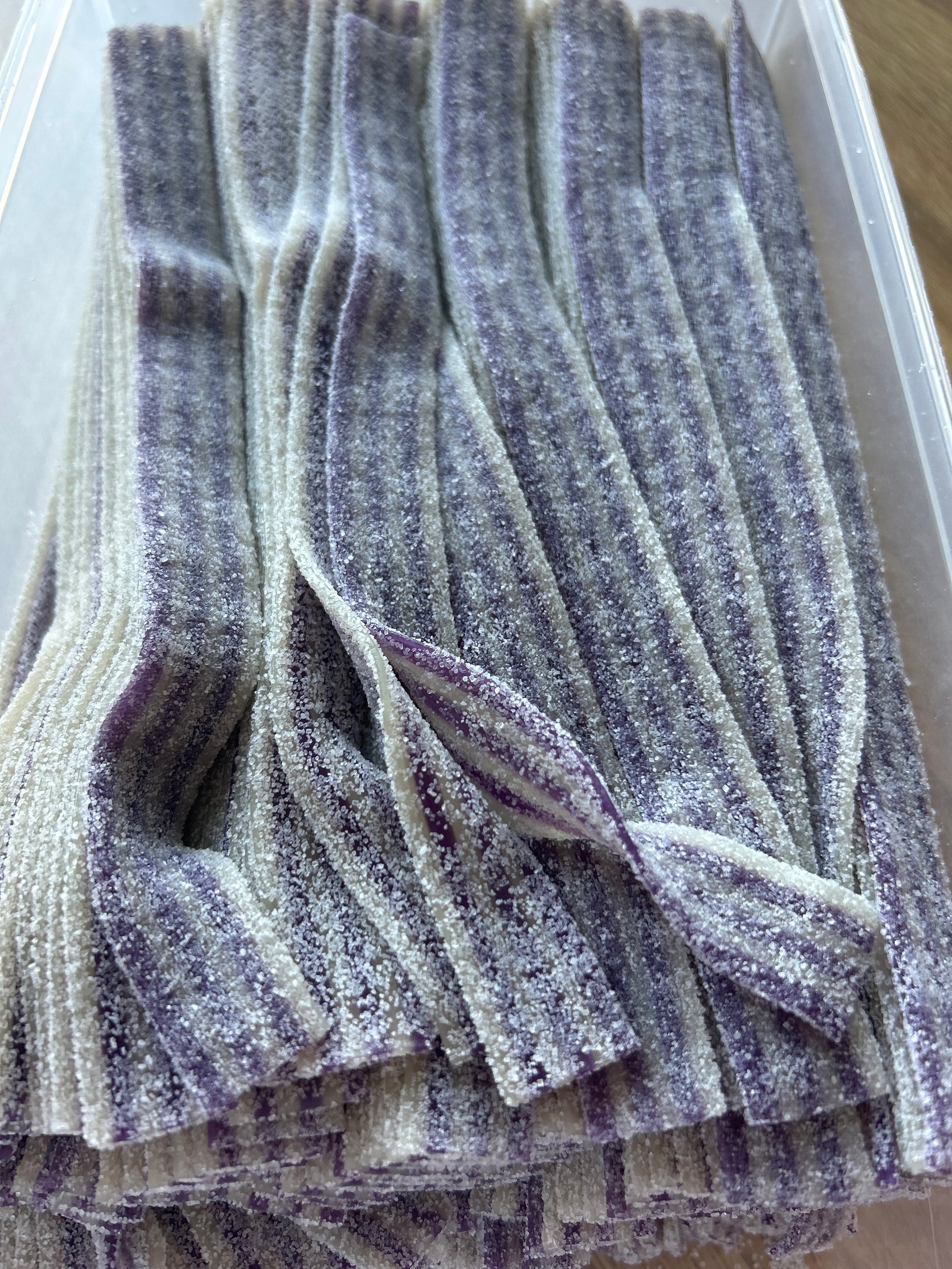 Ingredients: Sucre, Sirop de glucose-fructose, FARINE DE BLÉ, Eau, Acidulants : E330, E296, Graisse végétale (Noix de coco), Régulateur d’acidité : E350, Émulsifiant : E471, Arômes, Agent de conservation : E202, Coulorants E102*, E129*, E133, E341, E516.