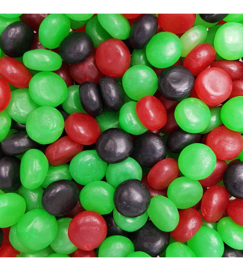Ingrédients: sucre; sirop de glucose; amidon; dextrose; acidifiant: acide citrique; correcteur d'acidité: citrate monosodique; arôme; colorants: curcumine, carotènes végétaux, bleu patenté V, anthocyanes, charbon végétal; agent d'enrobage: cire de carnauba.