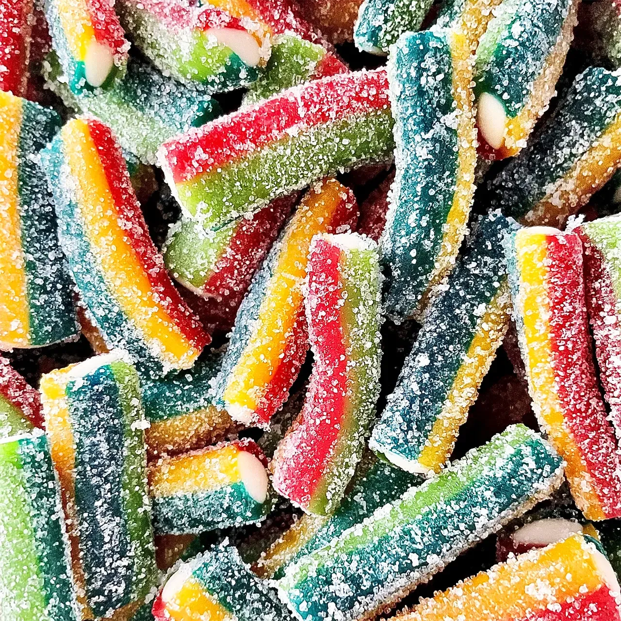 Ingrédients : Sucre, Sirop De Glucose Et De Fructose, Farine De Blé (Gluten), Amidon, Acidifiants: E296 Graisse Végétale (Palme), Gélatine, Acidifiants : E270, E330, Arômes, Correcteur D'acidité: E325, E331, Sel, Émulsifiant: E471, Humectant: E422, Colorants: E100, E120, E133,E160, E171.