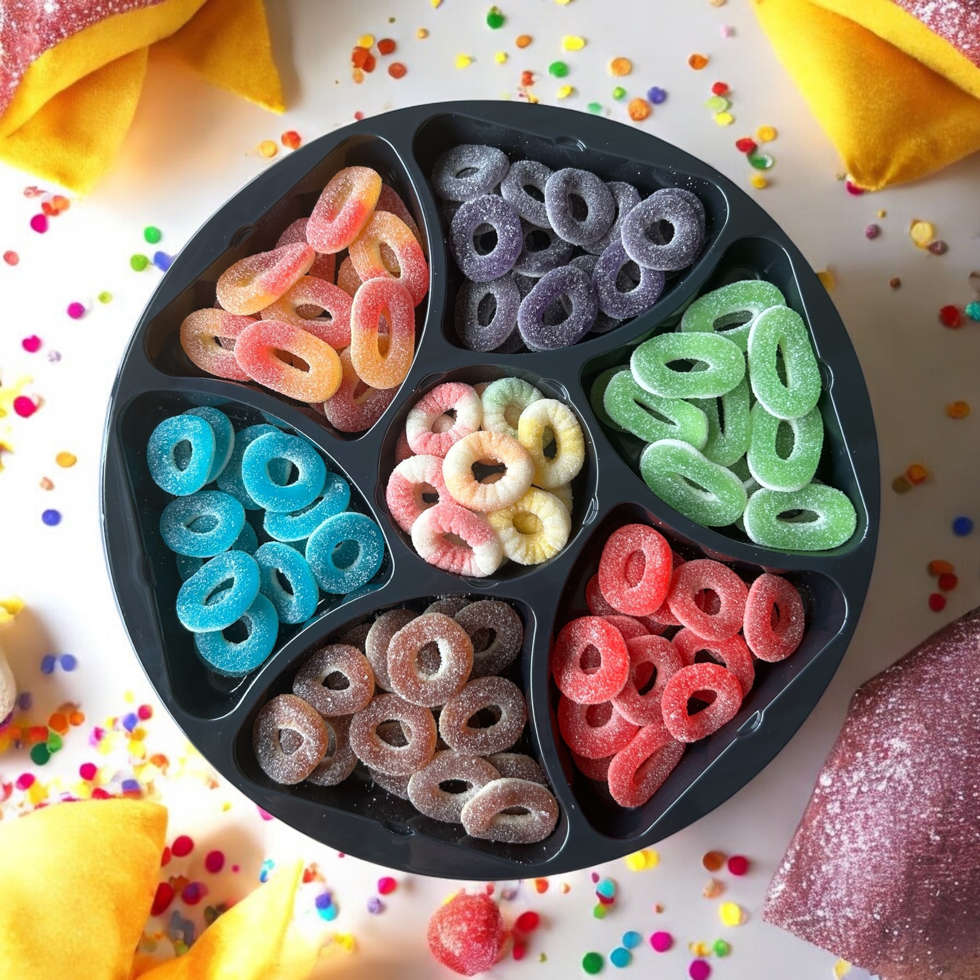 Apportez une touche de fun et de gourmandise avec ce plateau de bonbons composé exclusivement d’anneaux fruités ! Joliment présentés et soigneusement disposés dans une boite compartimenté avec un couvercle, ces anneaux gélifiés aux couleurs vives séduiront petits et grands.