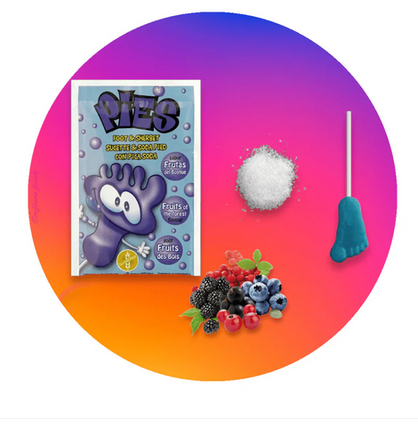 Pies, la confiserie en sachet comprenant une sucette goût Fruit des Bois en forme de pied à tremper dans de la poudre effervescente acidulée.