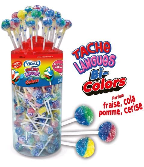Sucette bicolores assorties (goûts fraise, cola ou pomme) et qui colorent la langue !