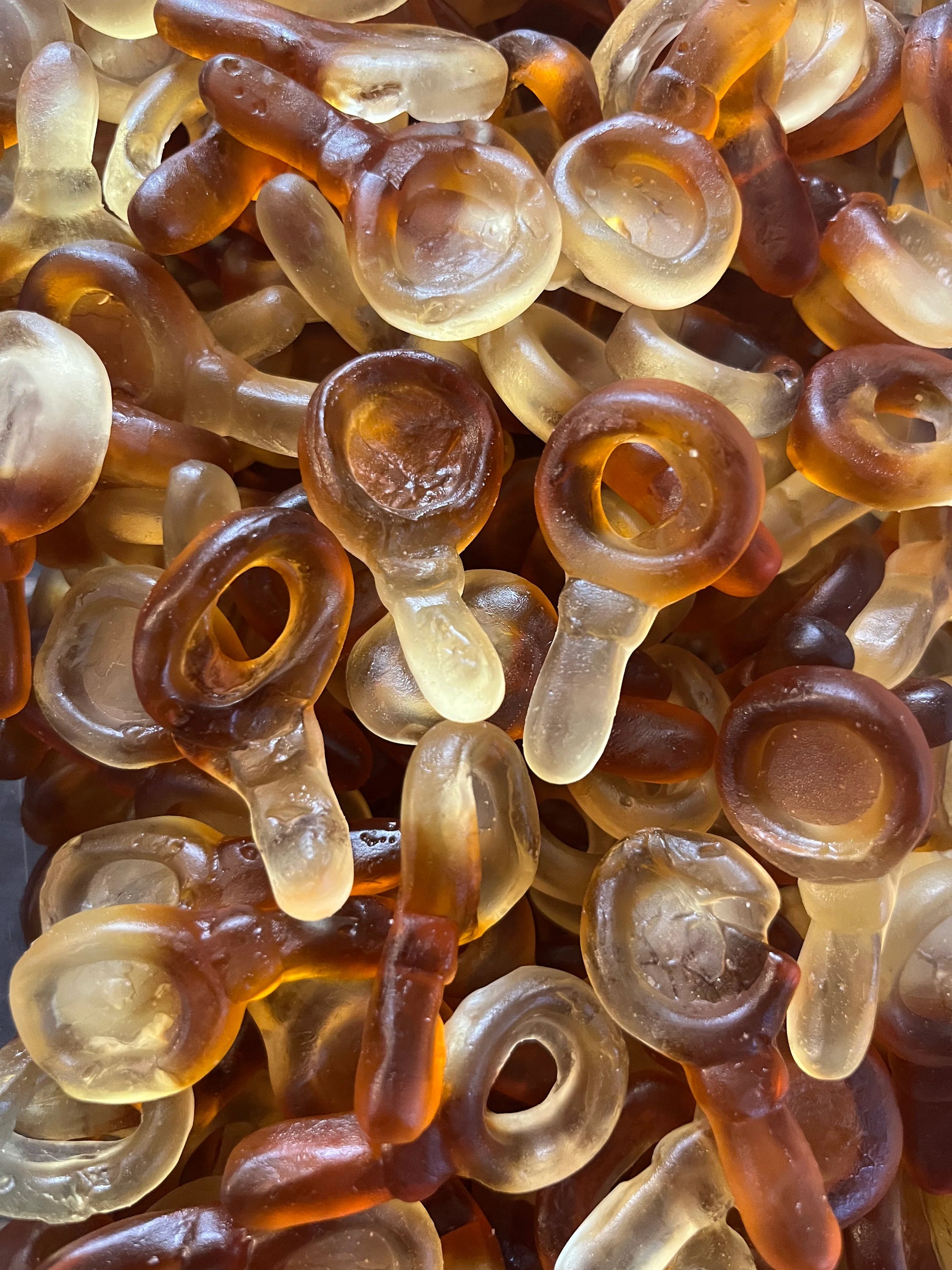 INGREDIENTS: Sucre, Sirop de glucose, Amidon de maïs modifié, Amidon de pomme de terre modifié, Acidifiant: acide citrique, acide lactique, acide malique, Sirop de caramel, Arôme, Huile végétale (cocos), Agent d'enrobage (cire de carnauba)