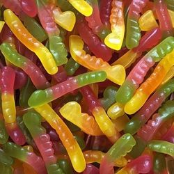 Ingrédients : Sirop de glucose, sucre, eau, sucre, amidon, gélatine de boeuf, acidifiants : E330, arômes, régulateur d'acidité : E331, agent d'enraobage : cire de carnauba, colorants : E100, E141ii, E160C, E163.